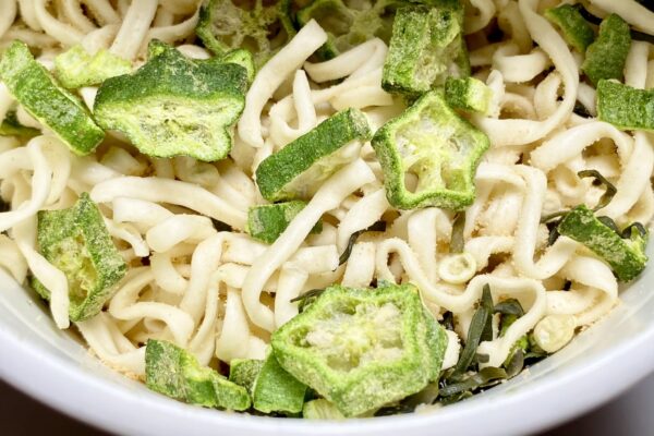 前述のように「おくら」と「めかぶ」だけの特化型ですが、どちらも乾燥具材とは思えないほど本格的。FDオクラは生のオクラを茹で上げたかのような品質で、風味や食感についてはもちろん、粘りもリアルなそれと遜色なし。もとより海藻は乾燥に強いカテゴリーなので、メカブは当たり前のように自然と戻ってくれますが、ワカメとは異なる滑りと歯触りが圧倒的な個性を表現。