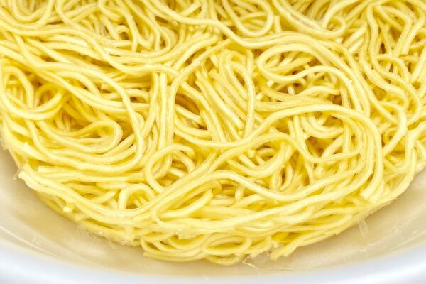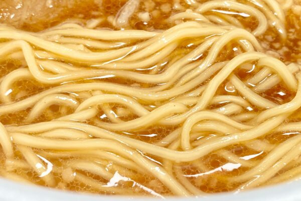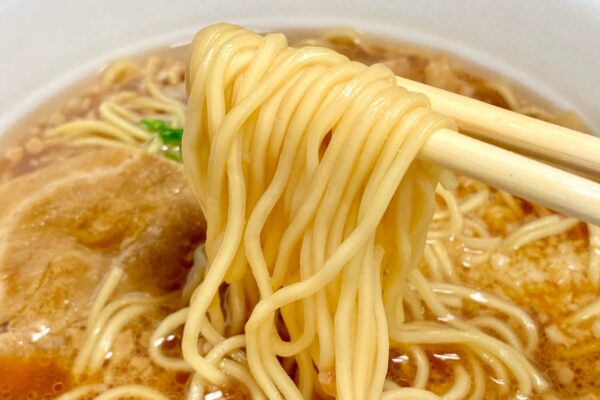 湯戻し時間は長めのわりに細めの切り出しですが、加水率(小麦粉に対する水分の割合)は比較的に低めの設定で、食べ始めからグルテンの粘りよりもプリっとした歯切れの良さが際立つタイプ。また表面のなめらかな質感から、ウエルシアが公開しているニュースリリースの “歯切れとなめらかさを兼ね備えたノンフライ中細ストレート麺„ という説明通りの質感です。ただ、新開発ではない様子。