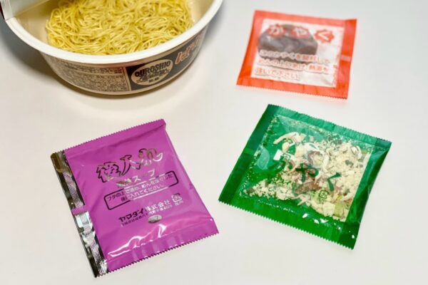 湯戻し直後、ヤマダイのノンフライ麺にしては珍しく若干のほぐれにくさを感じたのですが、あくまでもヤマダイの技術力を基準にしての話。ほぐれにくさに関してはストレスを覚えるほどではなく、熱湯5分きちんと守れば戻りムラも目立たない、安心と信頼の “凄麺クオリティ„ が如実に体験できる品質の高さ。