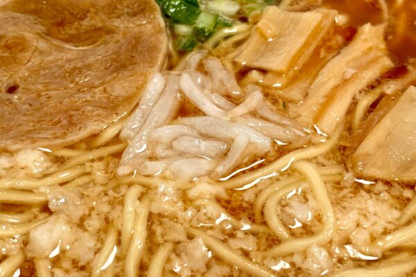 たまたま数日前に別件で実食した「凄麺 京都背脂醤油味」と酷似した組織だったので、それと同じノンフライ麺を流用している可能性大。そのため前述の販売価格を思うと‥‥みたいな部分はありますけど、けっしてクオリティが低いわけではなく、上品かつ芳醇に整った小麦感も含め、後述するスープとの相性に問題を感じることもありませんでした。