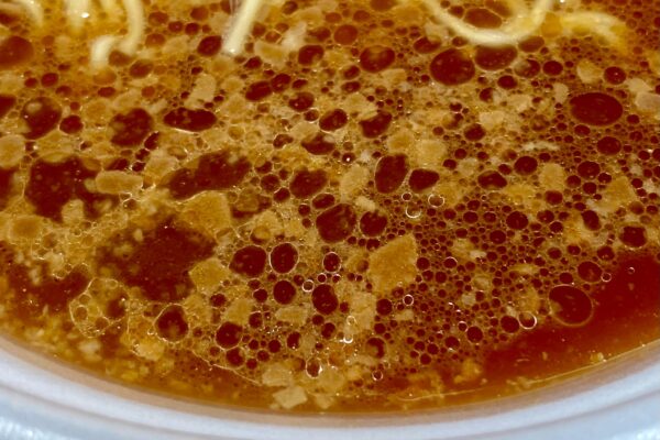ためしに “かやくを入れない„ パターンでも調理してみたところ、別添の「液体スープ」に含まれている背脂の粒は多く、多めの動物油脂から放たれる芳ばしさも印象的。一方で醤油のアプローチは意外と常識的というか、それについては筆者の宮醤油に対するイメージのバイアスもありますけど、しっかり濃いめなのに攻撃性は控えめで、見た目のわりにバランス重視のフレームワーク。
