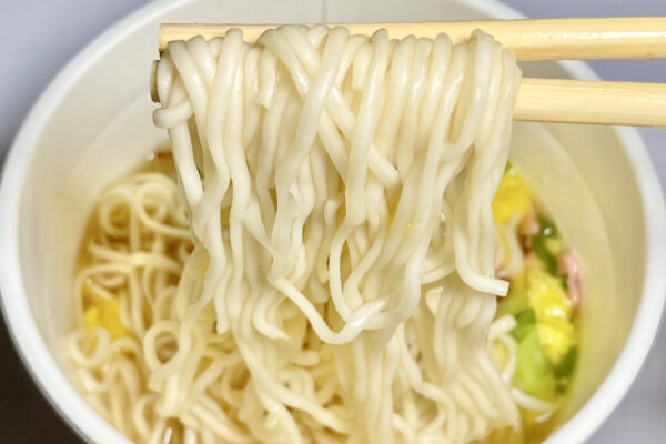 前述のようにタマゴはフレーク状と線状の2種類で、これはNB(ナショナルブランド)商品の「明星 中華三昧タテ型 榮林 酸辣湯麺」などにも使われてきたテクニック。フレーク状のタマゴは優しい口当たりと甘さで、線状のタマゴは食感のアクセントに寄与している、一見すると地味なようで効果的な使い分け。