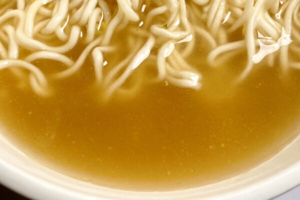 多少の縮れが見られるとはいえ、いわゆる縮れ麺のそれほど強いわけではなく、むしろ形状的にはストレート麺の部類。もちろん、揚げ油に由来する独特のニオイは皆無。また細さと後述する適度なとろみが相俟って、つゆとの一体感も申し分ありません。しかも、調理前の麺重量は50g(レギュラーサイズのカップラーメンにおける標準は60g)と平均よりも控えめなのに、膨張率の関係か少ないと感じないんですよ。むしろ多くてビックリw