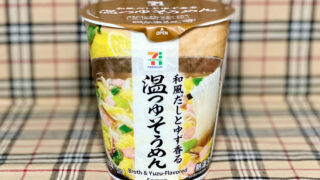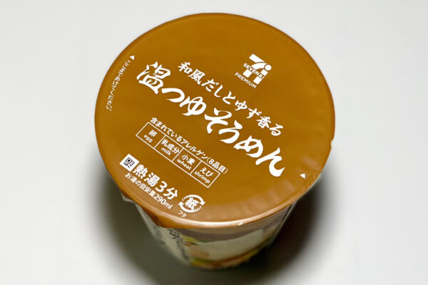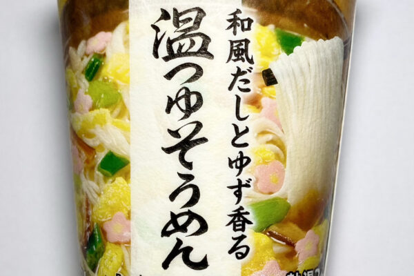 温つゆだったら「にゅうめん」だろ? というツッコミはさておき、パッケージには “和風だしとゆず香る„ との訴求があるため、セブンイレブンの惣菜コーナーにある「柚子香る お出汁のそうめんスープ」あるいはセブンプレミアムの「フリーズドライにゅうめん とろみ柚子」を即席カップめんでも楽しめるようにしよう、みたいなコンセプトが開発背景にあったのかなと。