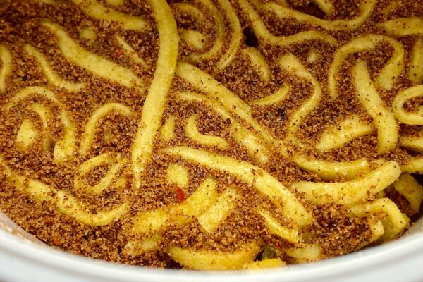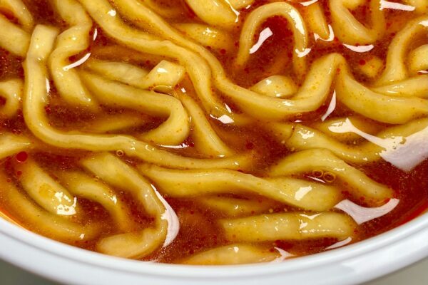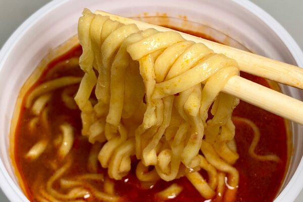 エースコックといえばの揚げ油に由来するニオイは1年前の「極太!多加水真空仕立て麺」よりも強めに漂ってくるけれど、それも含めて後述するスープとの相性に問題はなく、むしろ辛いスープとジャンクさを高め合う相乗効果あり。当たり前のように耐久性も優れているため、食べ終わる頃になっても特徴的な弾力が衰えることはなく、むしろ後半にかけて魅力が増しているように感じました。