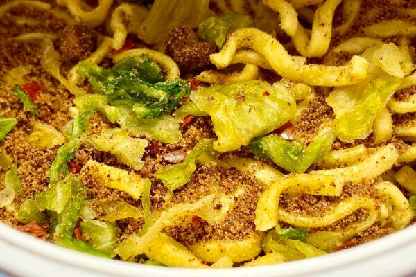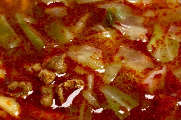 シャキシャキとした食感の良いキャベツ、程良く味付けした肉そぼろ、唐辛子を加えました。