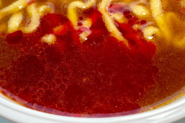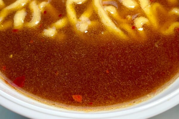 そのため斬新な要素は見当たらなかったけれど、別添の「液体スープ」を加えた途端、唐辛子の辛味とニンニクのエッジが際立ち、なるほど「驚もちっ麺」に負けない “しっかり濃くて辛い„ ストロングテイストを体現。辛さレベルは得意な方だと中辛以上〜ふつうに辛口、苦手な方にとっては辛口以上の水準に到達していますが、同時にウマミも強いので、辛さだけが独り歩きするようなスープではありません。
