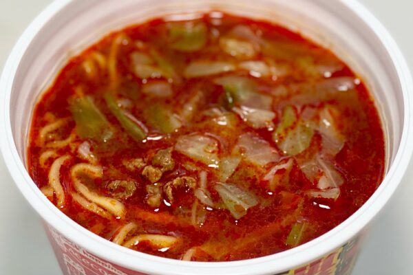 そのような不安を覚えながら熱湯を注ぎ、フタの上で「液体スープ」を温めながら待つこと5分。時間になったらフタを剥がし「液体スープ」を加え、よく混ぜ合わせたら出来上がり。キャベツの量はタンメンらしく(そこそこ)多めに入っていますけど、肉そぼろの量は笑っちゃうくらい少なくてw というのも「スタミナ豚骨醤油ラーメン」との共通点。ただ、無論のこと香りは別物。