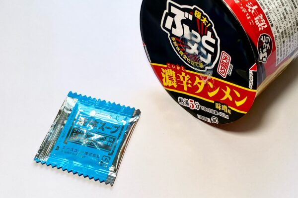 ——で、今回のカップ麺に別添されている小袋は、フタの上に貼り付けてあった「液体スープ」1パックのみ。エースコックのタテロング製品といえば、容器の中で小袋が粉末スープまみれになっている光景が定番だったのに、すこし前にレビューした「千年こうじや」監修のカップ麺と同じく容器の中に小袋は入っていません。粉末まみれの小袋にストレスを感じているユーザーも多かったので、ついにラインを変更し始めたのでしょうか。
