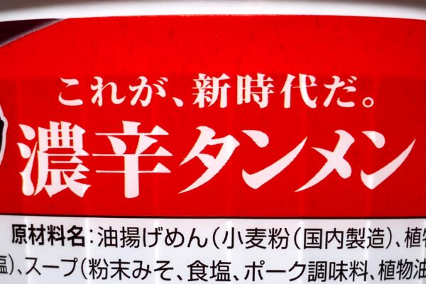 | 【原材料名】油揚げめん(小麦粉(国内製造)、植物油脂、植物性たん白、食塩)、スープ(粉末みそ、食塩、ポーク調味料、植物油脂、香味油、砂糖、豚脂、ガーリックペースト、香辛料、おからパウダー、乳化油脂、酵母エキス、全卵粉)、かやく(キャベツ、鶏・豚味付肉そぼろ、唐辛子)/ 加工でん粉、調味料(アミノ酸等)、カラメル色素、炭酸Ca、増粘剤(キサンタンガム)、乳化剤、かんすい、酒精、微粒二酸化ケイ素、カロチノイド色素、甘味料(カンゾウ、アセスルファムK、スクラロース)、酸化防止剤(ビタミンE)、香料、香辛料抽出物、酸味料、(一部に小麦・卵・乳成分・ごま・大豆・鶏肉・豚肉を含む) |