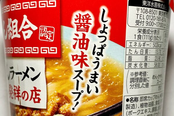 ちなみに製造所は酒悦の房総工場となっていますが、酒悦は1983年(昭和58年)7月より東洋水産が資本参加している連結子会社で、房総工場は “マルちゃんの工場„ という認識で問題ありません。それでは、引き続き “ちゃん系„ らしい要素やコストパフォーマンスについても注目しつつ「めん」「スープ」「かやく」の特徴を解説し、カップ麺としての総合力を判定します。