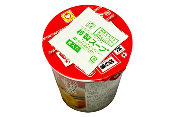 今回のカップ麺に別添されている小袋は、後入れの「特製スープ」1パックのみ。東洋水産の縦型ビッグに小袋が別添されている場合、大きく分けて「特製スープ」と「特製油」がありまして、前者はタレの役割を担った液体が含まれるパターン、後者は油(脂)だけ充填されているパターンになります。豆知識。