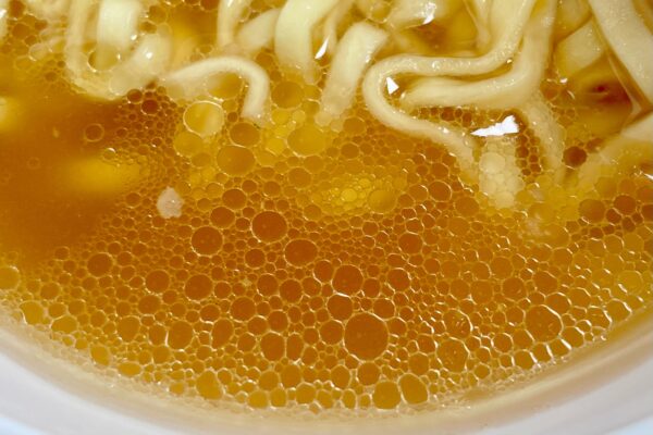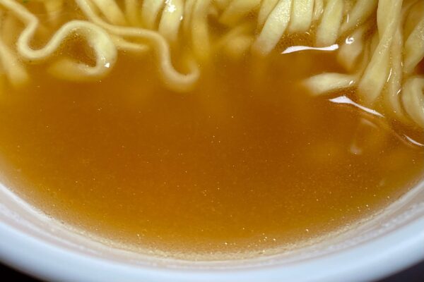 また特別に耐久値が高いわけでもなく、食べ始めのコシは折り返し地点から緩み始め、いかにも油揚げ麺らしい変遷を辿っていくのですが、麺とスープの相性は後半に軍配。また揚げ油に由来すコクやる風味に至るまで、後述するスープの世界観を尊重し、きちんと調和。いったん再現度は横に置き、ひとつのカップラーメンとして俯瞰すると、かなり相性がいい取り合わせであることが実感できます。