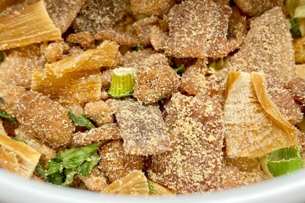 カットされた豚肉は東洋水産が頻繁に使ってくるアイテムで、醤油と砂糖で甘辛く炊いたやつ。さらに豚肉本来の旨みも強いので、スープの味わいに強く影響する側面があり、たとえば鶏白湯なんかだと悪さを働くこともあるけれど、今回の場合はスープの方向性も豚ベースの畜肉系ですから、悪さを働くどころか肉の旨みを強化してくれるポジティブな取り合わせ。