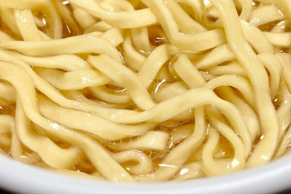 実店舗では “やや加水率が高めの中細ストレート麺が主流„ と前述しましたが、それをイメージしているはずの油揚げ麺は比較的に加水率が低く、すすると表面に油揚げ麺ならではの小さな気泡を感じる口当たり。それなりの弾力や反発性は備わっているけれど、やや加水率が高めの麺を忠実に再現したような質感ではありません。
