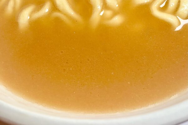 また二郎インスパイア系といえばのワシワシとした食感も皆無に等しい仕上がりですが、コラボ系の縦型ビッグ製品における麺重量は平均70gなのに対し、それよりも5g増のボリュームかつ食べ終わりまでキープされるモチモチとした弾力で食べ応えはバッチリ。二郎インスパイアらしさや「チャルメラ」らしさを意識しなければ‥‥というのもアレなんですけど、後述するスープとの相性は悪くありませんでした。