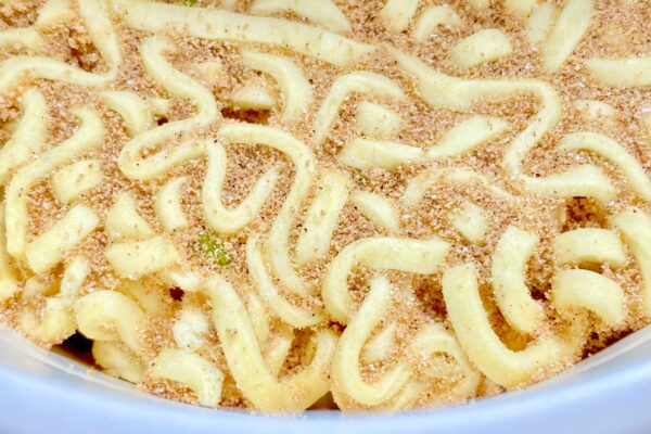 麺は油で揚げたフライ麺で、湯戻し時間は長めの5分。ポークエキスや香辛料(ガーリック)で下味を施しているため、スープとの親和性は高そうです。とはいえ値段的に明星食品が得意としているワシワシとしたノンライ麺を使ってほしかった気持ちもありますけど、今回は商品名にも入っているように「チャルメラ」ブランドのカップラーメンですから、そっちのイメージ的にはフライ麺ですよね。