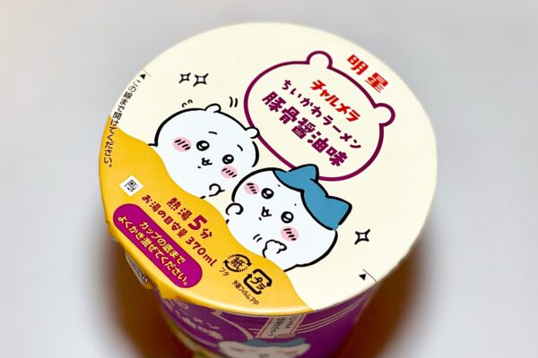 いやでも明らかに「郎」がモデルだろ——などと思いつつ、さておき今回のカップ麺に小袋は別添されていないため、二郎系といえばのアブラやニンニクを充填した小袋が別添されていないのは寂しいポイントになりますが、フタを剥がして熱湯を注ぐだけの手軽さとゴミが減るのはメリット。そういえばミニカップのフタ裏には『ちいかわ』のキャラクターがデザインされてるんですけど、手元にある商品のフタ裏は無地でした。
