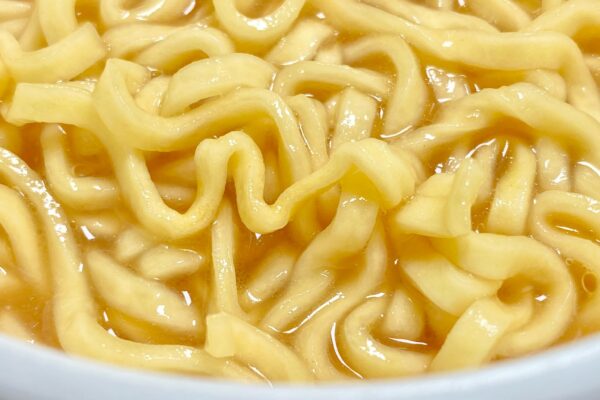前述のように小袋は別添されていないため、フタを半分まで剥がしてから内側の線まで熱湯を注ぎ、フタをして待つこと5分。ちいかわナルトは2枚しか入っていませんでしたが、調べてみたところ運が悪かった様子。ちなみにフタの開封口に “カップの底までよくかき混ぜてください„ との注意書きがあったので、お召し上がりの際は留意してください。