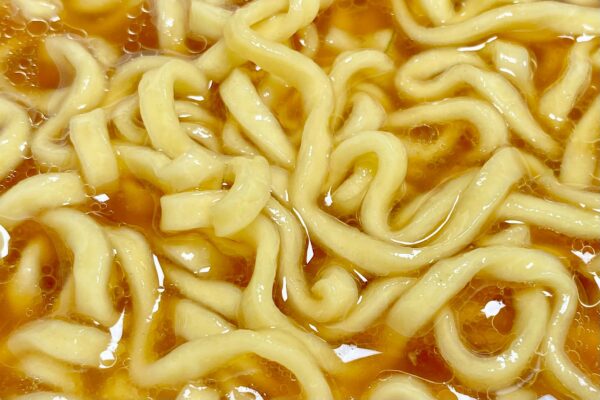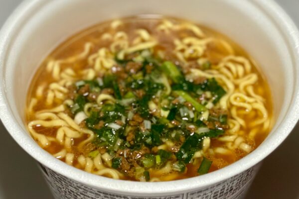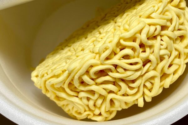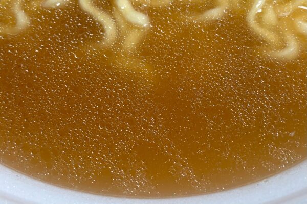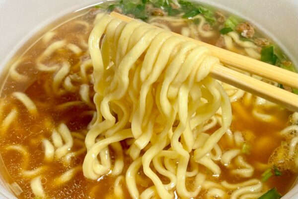 2025年9月8日発売の「超大盛りスーパーカップ 濃厚豚醤油ラーメン」(298円+税)と原材料名の構成が同じだったので、そこからの流用かと思いきや質感は別物。超大盛りスーパーカップの油揚げ麺は “内部に太めの芯が待ち構えている2層構造„ かつ “内側からブチンと弾けるような歯切れ„ が印象に残ったのに対し、こちらは外層から内層までの弾力が均一で、弾けるような抵抗力よりも粘りのある包容力が印象的。