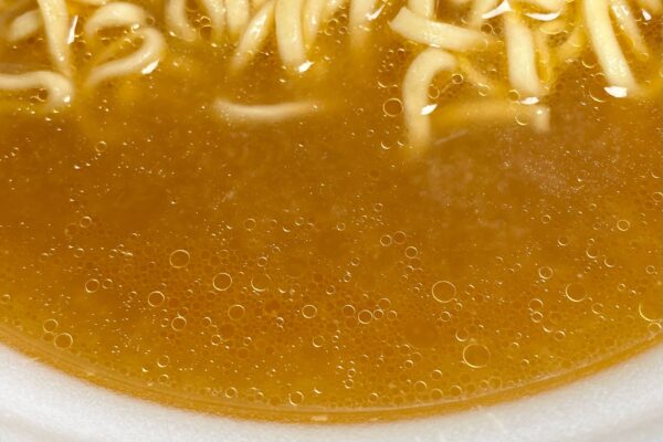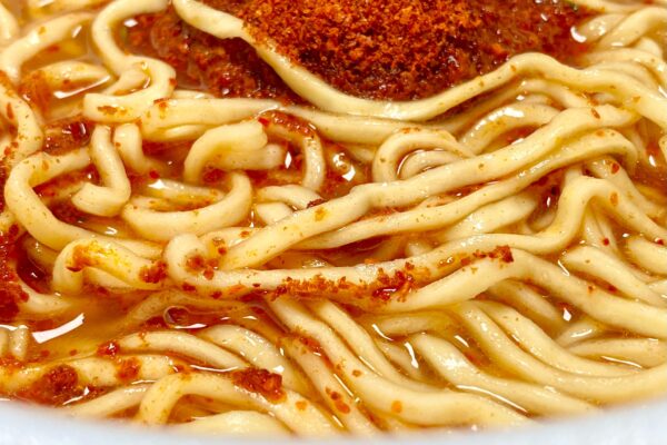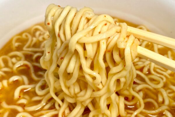 などと思いきや、なんのなんの。もちろん時間の経過に伴い食感は劣化していきますが、その変化は過去の「超大盛りスーパーカップ2.0倍」と比較して緩やかで、きちんと最後まで(よほど時間をかけて食べない限り)適度な弾力は残ります。それと熱湯を注ぐ前の余談なのですが、なんかマクドのフライドポテトみたいなニオイが漂ってきたんですよね。おそらくロットの関係だとは思いますけど、めっちゃフライドポテトでした。