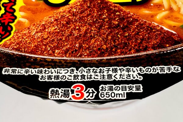 また開封口には “非常に辛い味わいにつき、小さなお子様や辛いものが苦手なお客様のご飲食はご注意ください„ という激辛系のカップラーメンで定番の警告文が記載されており、なおかつ特に辛さを強調しているため、辛味の強さにも注目しながらレビューします。