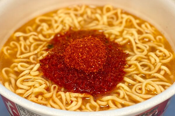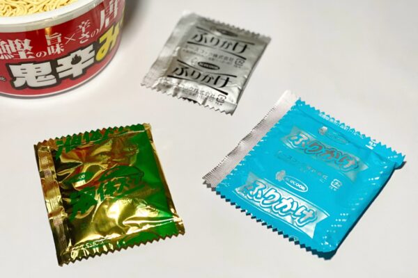 今回のカップ麺に別添されている小袋は、後入れ「液体スープ」と「ふりかけ」2種の組み合わせで、該当のニュースリリースには “ポークをベースにジンジャーやガーリックなどの風味を加えた味噌ラーメンスープです。別添のふりかけを加えることで、辛さと鰹の旨みが食欲をそそる鬼辛な味わいに仕上げました„ との商品特長を記載。