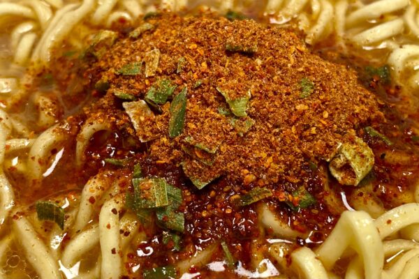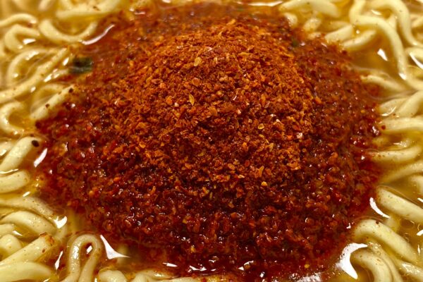 片や銀色の小袋に充填されていた「ふりかけ」は、潔いほどに赤唐辛子100%だったので、寿がきや食品の「麺処井の庄監修 辛辛魚らーめん」を辛さレベル5とするならば “辛さレベル4.5„ くらいの激辛仕様。ハバネロ特有のクセやブート・ジョロキアに由来する柑橘系の清涼感は皆無に等しく、トリニダード・スコーピオン・ブッチ・テイラーなどに挙げられる強烈な痛みを伴うほどではないけれど、瞬発力と適度な持続力を持った辛さ。