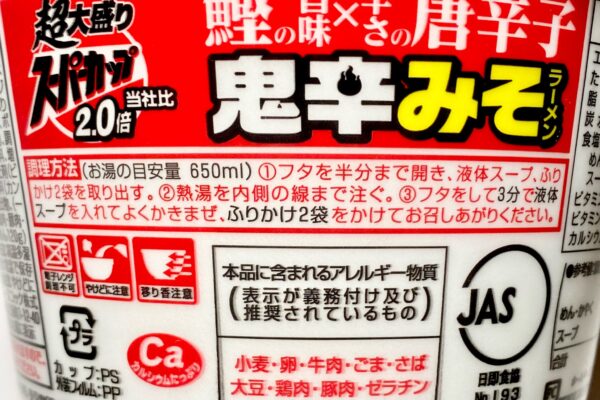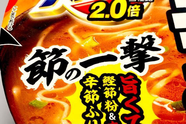 「横浜家系豚骨醤油ラーメン」と「濃厚豚醤油ラーメン」は2.0倍を超える “めん130g„ だったので、商品名は2品とも「超大盛りスーパーカップ ○○ラーメン」となっていたのですが、今回の「鬼辛みそラーメン」は「たらこ注意報 たらこ味塩ラーメン」や「豚骨醤油ラーメン 関西風から関東風」と同等のボリュームです。あと、実食前に触れておきたいのが「鬼辛」と「節の一撃」について。
