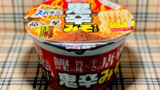 「横浜家系豚骨醤油ラーメン」と「濃厚豚醤油ラーメン」は2.0倍を超える “めん130g„ だったので、商品名は2品とも「超大盛りスーパーカップ ○○ラーメン」となっていたのですが、今回の「鬼辛みそラーメン」は「たらこ注意報 たらこ味塩ラーメン」や「豚骨醤油ラーメン 関西風から関東風」と同等のボリュームです。あと、実食前に触れておきたいのが「鬼辛」と「節の一撃」について。