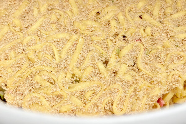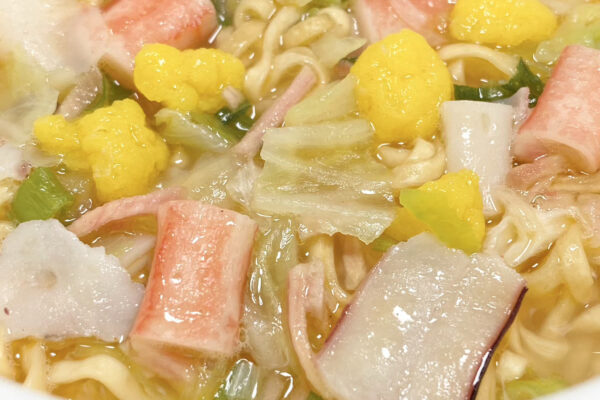 以前から「シーフードヌードル」のスープに使われていながらも、意外とその存在が知られていなかった紅生姜を主役に立てるため、いつものスープとカニカマ・キャベツ・スクランブルエッグ・イカ・ネギを据え置いたまま、具材としての “紅しょうがチップ„ を今だけ採用。