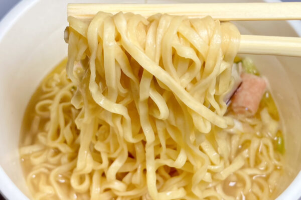 麺は油で揚げたフライ麺で、湯戻し時間は標準の3分。約2mm幅のサイズと原材料名の並びも定番の「シーフードヌードル ビッグ」と完全に一致するため、まったく同じ麺を使用しているのでしょう。まるか食品の「ペヤングやきそば」しかり、スープの味付けを激しく選ばないため、この麺が使い回せる(=大幅なコストカットに繋がる)ところも大きな強みの一つ。