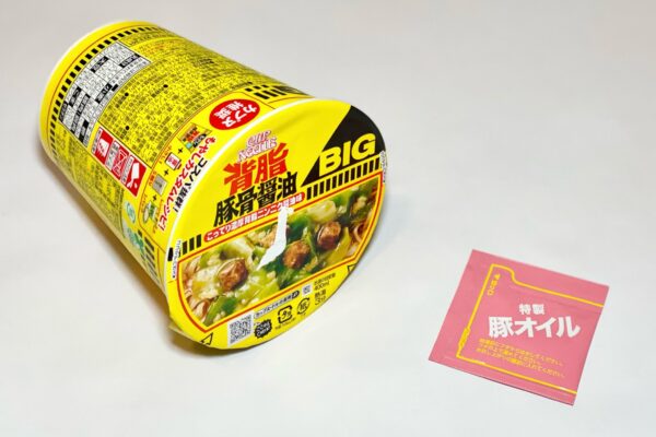 今回のカップ麺に別添されている小袋は、後入れの「特製豚オイル」1パックのみで、日清食品が展開してきた二郎インスパイア商品の特徴から察するに、豚ラ王(ヤサイ、アブラ、ニンニク)の系譜に連なる例の豚臭いオイルが充填されている可能性は高め。