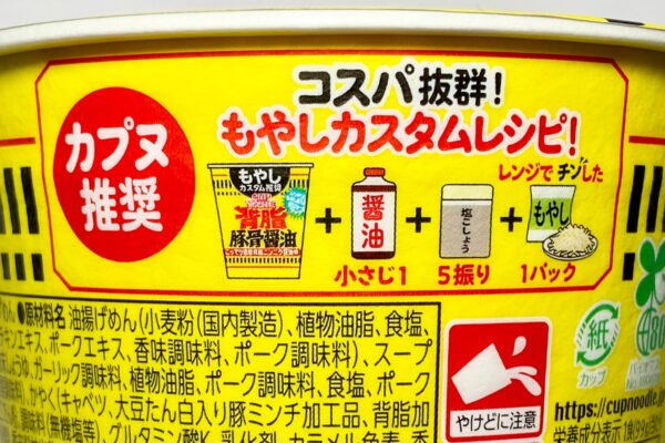 また味わいのテーマが「にんにく豚骨」ではなく「背脂豚骨醤油」であること、加えて最大の見どころといっても過言ではない “もやしカスタム推奨„ の訴求は新鮮味を感じるポイントで、パッケージの側面にはカプヌ推奨の「コスパ抜群! もやしカスタムレシピ!」が印刷されているのですが‥‥