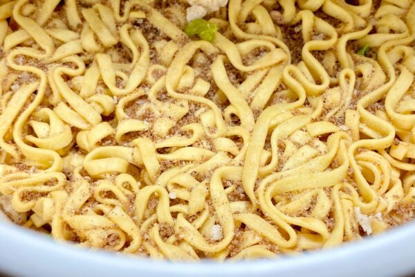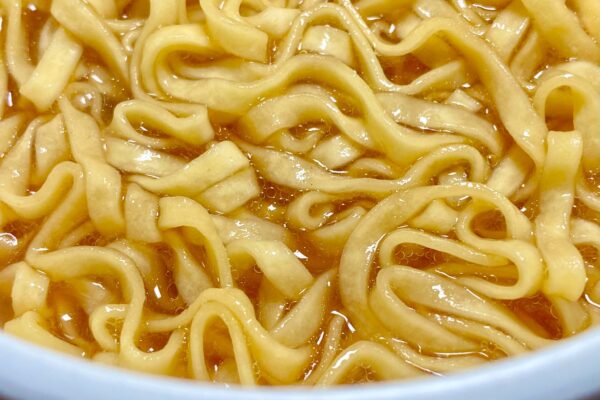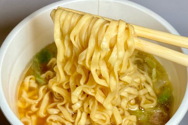 カップヌードルのブランドに使われるフライ麺には、大きく分けて約2mm幅の通常サイズと約3mm幅の太麺があり、今回は後者。前述のように「小麦粉(国内製造)、植物油脂、食塩、糖類、しょうゆ、チキンエキス、ポークエキス、香味調味料、ポーク調味料」という原材料名の構成とサイズは、既存の「担担」や「魚豚」と同じなので、これが人生初のカップヌードルでなければ目新しさはないでしょう。