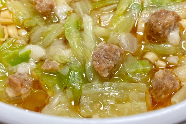 かやくは謎肉(なぞにく)の愛称で親しまれている大豆たん白入り豚ミンチ加工品とキャベツ、背脂加工品の組み合わせで、もやしカスタムを推奨しているだけに、もやしは各自で用意しろと言わんばかりのラインナップ。ちなみに添加物の話なんですけど、加工食品で頻繁に使用される食品添加物といえば「調味料(アミノ酸等)」が有名ですが、今回は「調味料(無機塩等)」を使用しています。