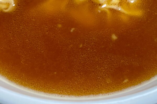 実店舗の二郎インスパイア系に使われる麺といえば、日清製粉の強力粉・オーション(灰分0.52±0.04%の2等粉)で打った加水率の低い極太麺が定番で、ワシワシとした食べ応えを特徴としているのに対し、今回のフライ麺は系統的に真逆。そのため二郎インスパイア系の雰囲気は皆無に等しいというか皆無なんですけれども、これがカップヌードルのアイデンティティであり、後述するスープとの相性も悪くありません。