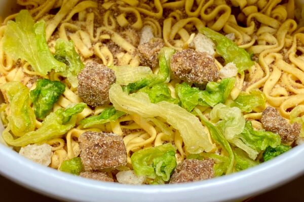 謎肉についての詳しい解説は不要かと思いますけど、スープとの関係か微妙に配合が異なるのか、定番の「カップヌードル」に入っている “味付豚ミンチ„ よりも体感的にサッパリとした代物。二郎のアイデンティティといっても過言ではない豚(ぶた)のような充足感は得られないし、数も極端に多いわけではありません。