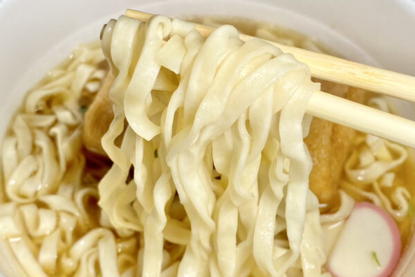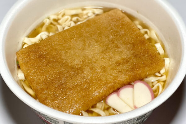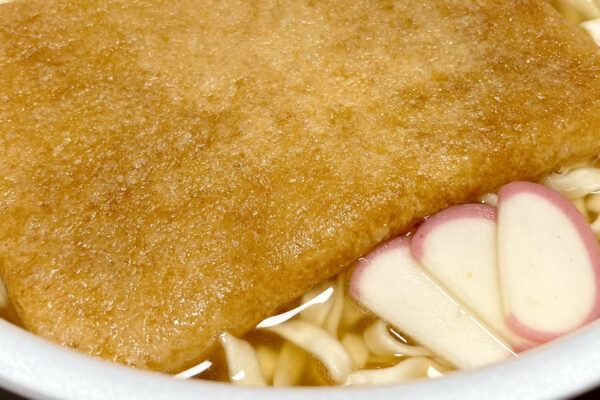 日清食品のニュースリリースには “醤油の味わいが際立つおあげ„ と記載されていましたが、東日本向けの現行「きつねうどん」に入っている “醤油感にこだわった味付けのおあげ„ よりも醤油感は弱く、どちらかといえば甘みのほうが強めに主張してくる味付け。また、ふっくらジューシーな食感やサイズも現行おあげと変わらないので、あまりノスタルジックな印象は受けません。ええ、おかげで最高に美味しいですよ。