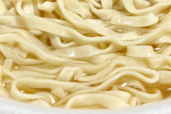 はたして50年前にもデキストリン(水溶性食物繊維)を配合していたのかどうかは定かでないけれど、まさに熱湯3分のペラペラうどん(1994〜2000)を彷彿とさせるチープさで、令和の “つるみのあるもっちりとした食感のストレート麺„ とは一線を画す、薄くてウェーブがかった形状ならではの口当たりが印象的。