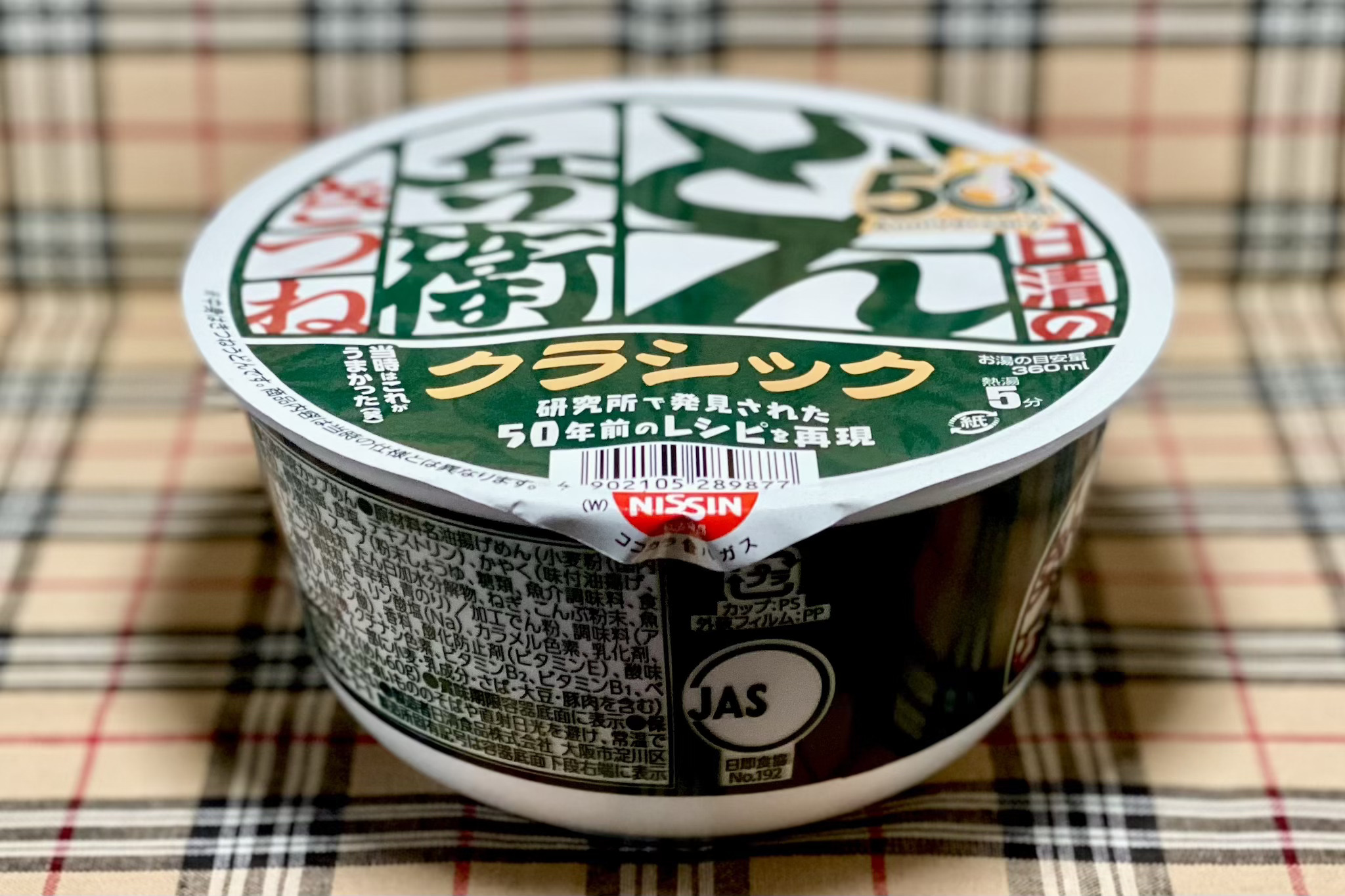 このページでレビューする「日清のどん兵衛 きつねうどん クラシック」は、日清食品グループの研究所で発見された50年前のレシピに基づき「どん兵衛」発売当時の味わいを再現した一杯で、SNSではキャッチコピーの “当時はこれがうまかった(笑)„ が賛否を巻き起こしていますが、筆者は開発背景の「50年前のレシピを再現」という部分に畏怖のような念を抱きました。