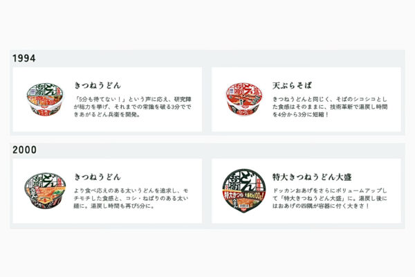 筆者の中に残っている “あの頃のどん兵衛„ は、顧客の「5分も待てない!」という声に応え、日清食品の研究陣が総力を挙げて湯戻し時間を3分に短縮した、1994年(平成6年)以降のペラペラうどん時代。この頃に初めて「日清のどん兵衛」を食べたので、かなり思い出補正が強いです。