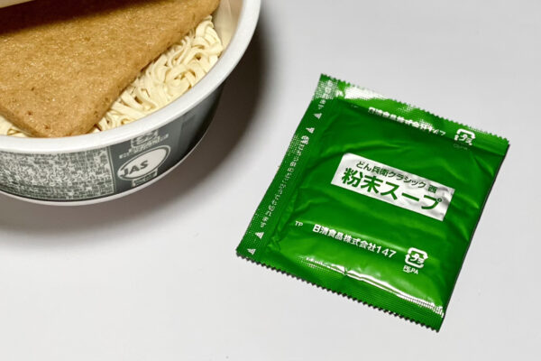 今回のカップ麺に別添されている小袋は、先入れの「粉末スープ」だけのシンプルな構成で、定番の “彩り七味„ は入っていません。ちなみに同時発売品の「天ぷらそば クラシック」は全国共通の味わいですが、こちらの「きつねうどん クラシック」は東西で味が違います。東日本向けは開封口や容器側面に(E)の記載があり、西日本向けは(W)となっているため、そこで判断してください。※このブログでは西日本向けを評価します。