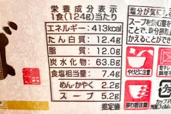 | カロリー:413kcal たん白質:12.4g 脂 質:12.0g 炭水化物:63.8g 食塩相当量:7.4g (めん・かやく:2.2g) (スープ:5.2g) |