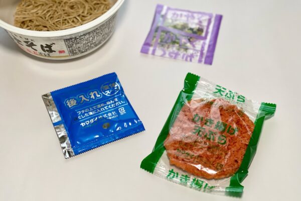 今回のカップ麺に別添されている小袋は、先入れの「かやく」に、後入れ「液体スープ」と「紅生姜かき揚げ天ぷら」の組み合わせで、液体スープと紅生姜かき揚げ天ぷらの小袋は昨年と同じデザイン。ただ、かやくの小袋は色が変わっているため、ここがリニューアルポイント‥‥?