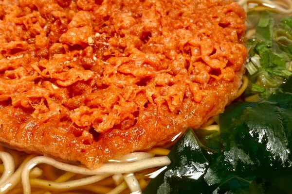 ちなみに後入れの「紅生姜かき揚げ天ぷら」は “つゆによくひたしてください„ とメーカー自らオススメしているので、しっかり箸で沈めるのが正解。それでもサクサクとした歯触りは意外と衰えないですし、ふんわりとした表面の優しさと中心部に残るサクサク食感&紅生姜の酸味による対比が味わい深く、天ぷらから滲み出る油脂分がノンフライそばの数少ないデメリット(コク不足)を解消してくれる優れ物。