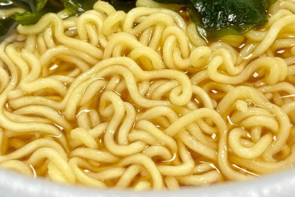 「わかめラーメン」に搭載されている油揚げ麺は、調理直後の状態でカタめの歯応えが楽しめる仕上がりで、しかしながら戻りムラなどは目立っておらず、適度な弾力が最後まで楽しめる耐久性も好印象なポイント。前述したエースコック特有の油揚げ麺臭も並行しますが、わかめのヘルシーなイメージにカップラーメンならではのジャンクさをプラスしてくれている、なんとも絶妙な取り合わせ。