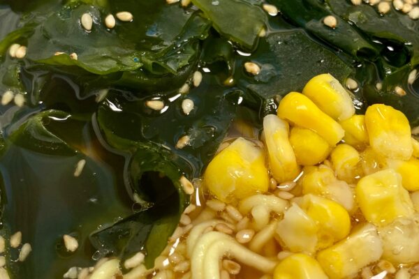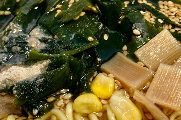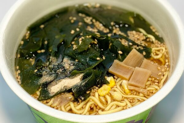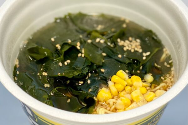 乾燥わかめの膨張率は、メーカーによって7〜15倍の幅が生じているため、一概には言えない部分になりますけど、その幅から算出すると平均的に10〜12倍。つまり、たった1gの差で調理後の印象は大きく変わります。無論、エースコックの「わかめラーメン」におけるボリュームは凄まじく、わかめと対比を描くメンマの食感とコーンの甘さ、そして商品名に “ごま・しょうゆ„ を掲げているように、ごまのアクセントもアイデンティティ。