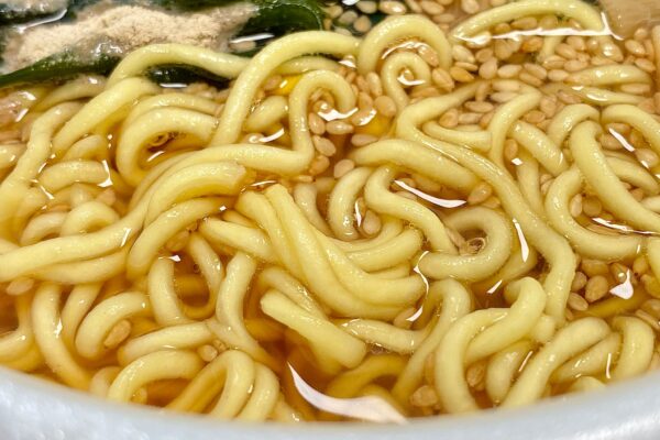 対する「ごつ盛り わかめ醤油ラーメン」のスープは、エースコックと同じく魚介エキスを使用してはいるものの、熱湯を注ぐ前に入れる「粉末スープ」のみで構成されているため、液体しょうゆ特有のフレッシュな要素は皆無に等しく、うまみ調味料やスパイスの使い方も雑で強引。隣に並べてしまったら、エースコックが誇る「わかめラーメン」の偉大さを再認識することになるでしょう。