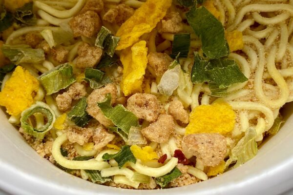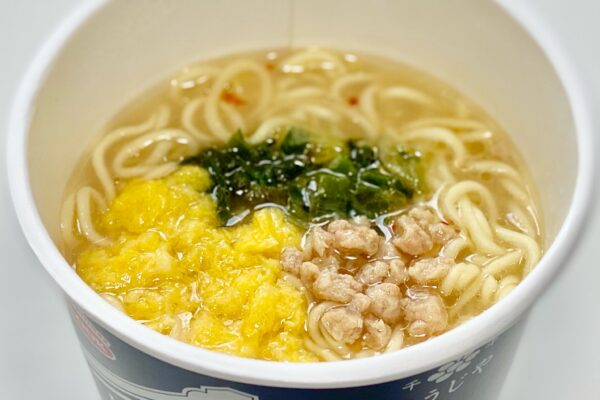 今回の小袋はフタの上に貼り付けてある「調味油」1パックのみ。かやくにワンタンを使用するなど、そういったケースであれば珍しくないパターンになりますが、容器の中に控えている具材は “程良く味付けした鶏肉そぼろ、彩りの良い卵、ねぎ、唐辛子„ だけなので、どのようなルールが定められているのかイマイチよく分かりません。